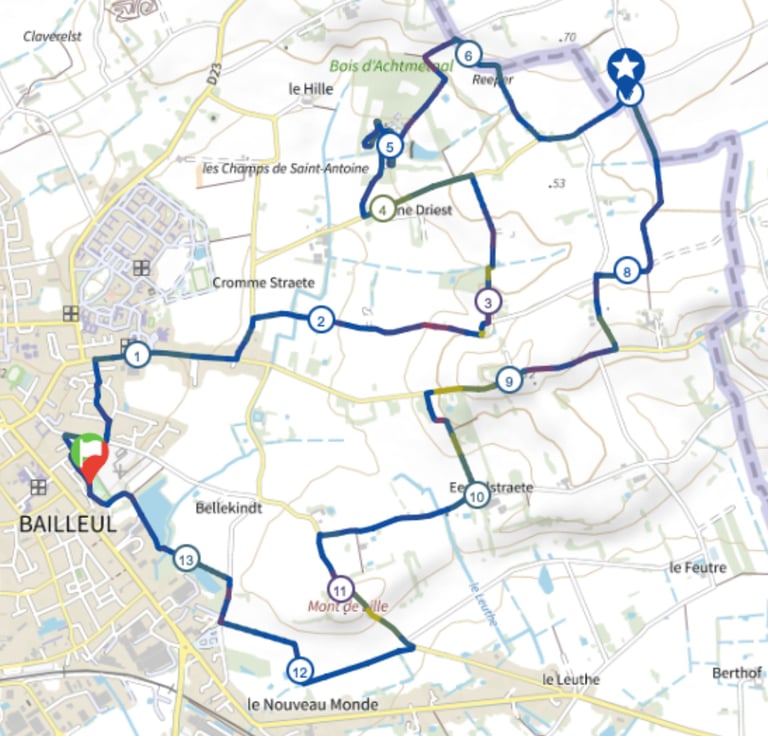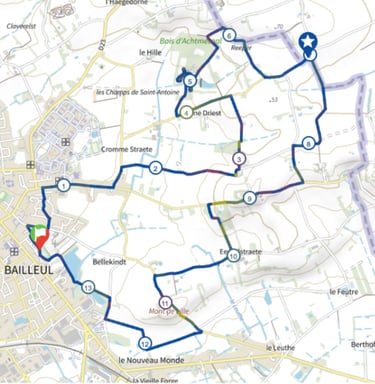 Le départ de la course sera donné à 10h00 au Parc Honoré Declercq, à Bailleul. Le parcours vous emmènera à travers le Ravensberg et la campagne Bailleuloise, avec un passage privilégié par le Conservatoire botanique de Bailleul, avant de revenir au village de course.